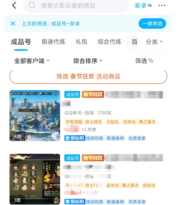 出售账号过程中要实在不知道值多少钱的话,现成的游戏专区里面账号大把,随便找两个商品参考一下,就能知道现在火影忍者账号市场价如何,要是想知道的更精准一些,大家可以筛选出自己账号里比较值钱的角色,然后专门去筛选带角色的账号就行,这样就能大概知道自己的号值多少钱。