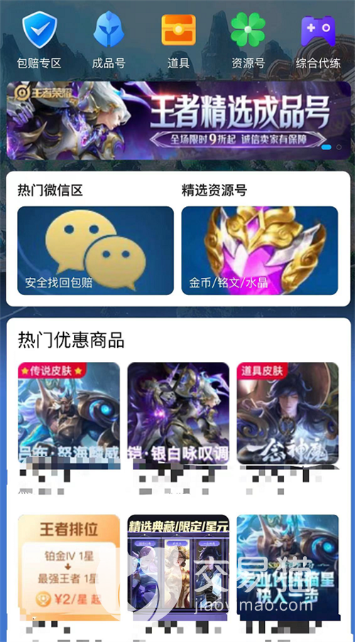 大家应该也知道,重点是平台里面要能去让用户去低价购买账号,所以针对王者荣耀,它准备了多个不同的专区,不论是资源号还是成品号,都是可以在这里选择的,像特定的皮肤号或者是高等级VIP账号,也能以低价购入,有时候也会开放九折限购福利给到大家,当然一些商品的优惠也在这里得到了全面的展示,方便玩家更好的去选购喜欢的商品,包括代练功能,也是能通过它来帮助大家达成哦。