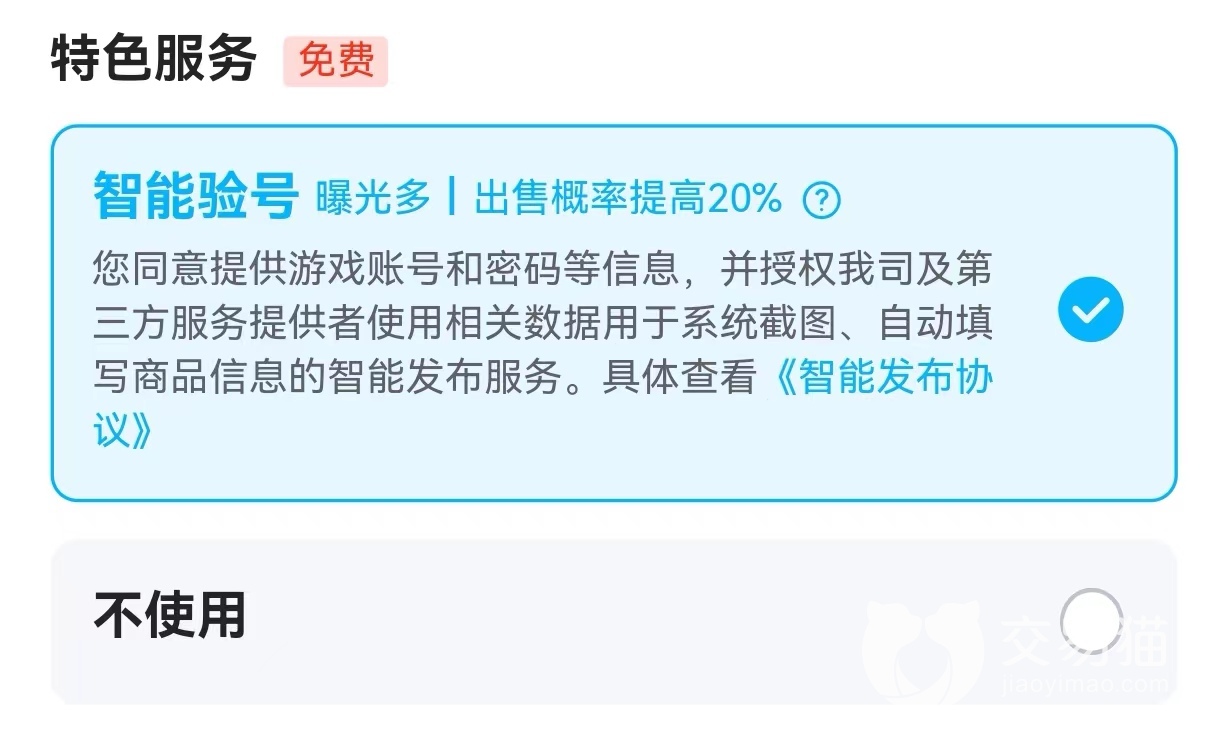 首要要给大家介绍一下平台的服务,可以说得上是很到位了。很多玩家都知道交易猫平台上的特色服务,智能验号就是非常便捷地帮助上架商品。有多方便呢?卖家只要提供账号密码就够了,后面的操作都是由平台智能发布,相当于是一步到位,等着交易完成收取货款就行了,相信这个功能一定是懒人的福音。