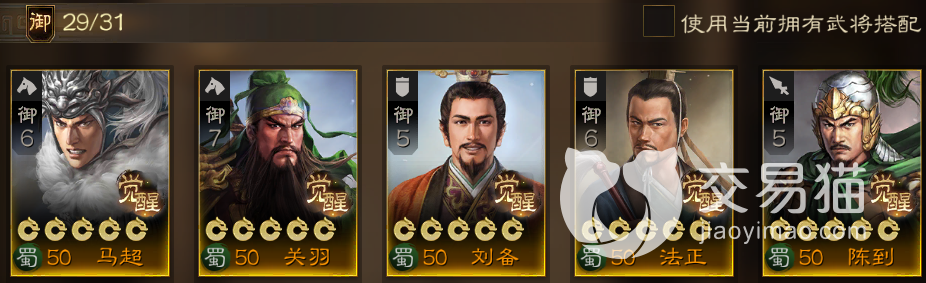 阵容配置:马超+关羽+刘备+法正+陈到。该阵容兵种较为全面,其中的两个骑兵是冲阵的根本,因为这一兵种是移动力最强的存在,加上陈到独特的战法机制,基本上前线除了刘备和法正会暂时滞留以外,三人都可以同时冲至前方发动出其不意的打击。当然,上述这套配置只是最完美的情况,五张金卡或许没有那么难凑,但指定要哪些人的话还是有一定难度的,所以下面小编将结合每个武将的情况来分析出适合为他们替换或过渡的人选。