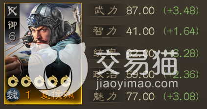 夏侯渊的武力与统率两项属性优秀,因此无论是伤害还是本身的抵御力都是不错的,然后在自带战法方面,其第一战法“虎步左右”效果是在普攻结束后额外对目标附近的两名敌人进行追加射击,虽然伤害会降低25%,但对于残血能够起到很好的收割作用。