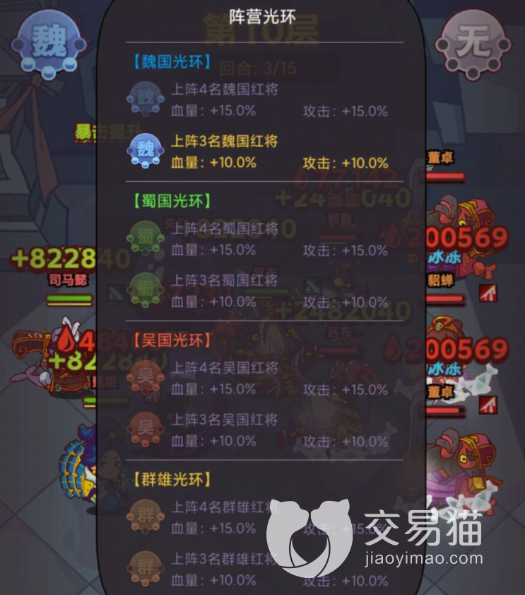 这么配置的原因是因为游戏内会有一个叫做“阵营光环”的机制,只要场上的红将,注意是红色的咸将,上阵时,当至少有三个同阵营的红将时,则会有额外的血量和攻击加成,所以各位小伙伴可以按照这个机制来配置阵容。