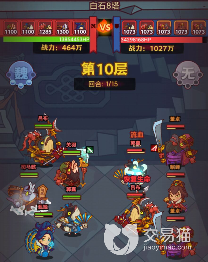 虽然说敌方的战斗力1027看起来很吓人,但其实只要我们达到500w上下就可以通关的,这个战斗力还是非常好达到的,主要是我们的配置,小编这里出的角色也是有吕布和郭嘉,毕竟这两个角色确实强势且搭配的很好,其他的角色小编则用的是关羽、司马懿和甄姬。
