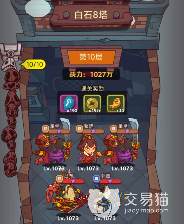 在战斗之前,我们先找到这一层,并点进去查看它的相关信息,我们可以看到敌人的战斗力是1027万,前排的敌人是吕布和郭嘉,后排是两个董卓和一个貂蝉,后排可以忽略不计,重点是在前排,毕竟一个是战斗力天花板,一个可以冰冻。