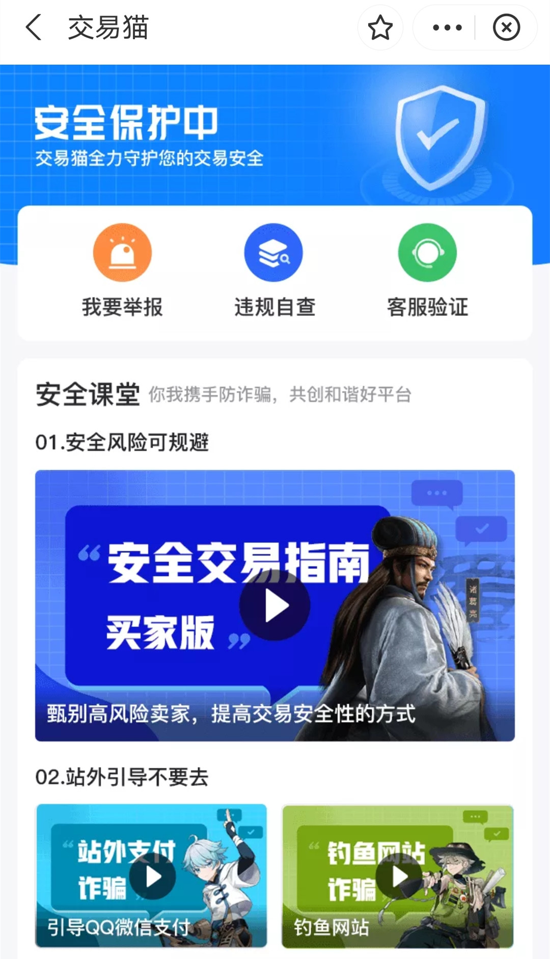 交易猫专门有安全课堂的板块,如果你是新用户,小编建议登录平台以后一定要去学习一下安全课堂的内容,尤其是注意不要到站外进行私下交易,这样不仅安全没有保障,如果出现问题连说理的地方都没有,另外在安全课堂还可以进行举报,如果你发现商品有违规问题,或者已经被骗就可以进行举报。