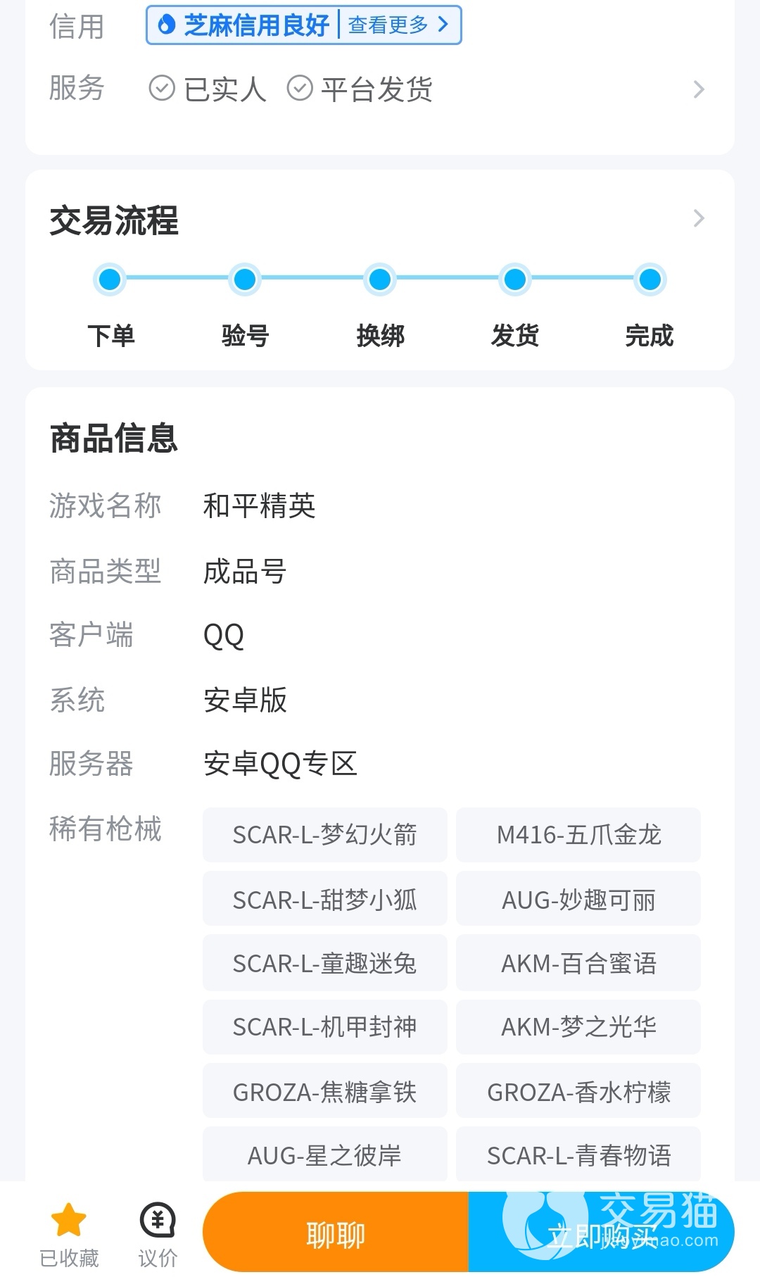 交易猫这个平台不仅可以购买一个现成的账号,还可以购买游戏当中的资源或者道具等等,通过搜索和平精英就会进入它的对应专区,里面就会有非常多的商家发布游戏账号的信息和一些资源道具等等,大家可以到他的详细信息中去查看商品类型和信息,比如有关账号的等级、客户端和含有的资源内容等等这样才能明确自己到底想要购买到一个怎样的账号。