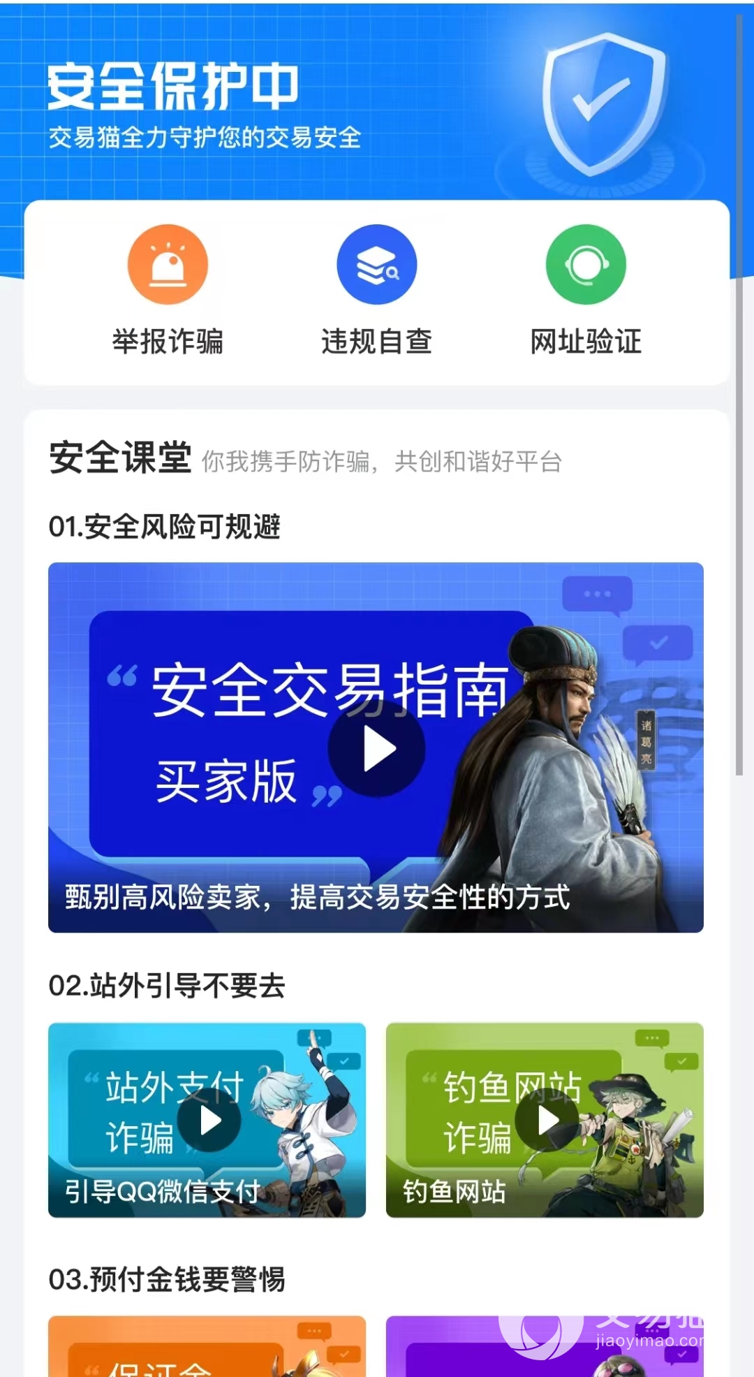 很多我们的新手玩家在购买账号的时候很容易被忽悠的,因此交易猫针对这一现象也为我们的玩家提供了许多的防骗指南,大家在安全中心里面即可以查看安全课堂里的视频等等的案例,相信你们学会这些之后,可以少走许多的弯路。并且即使你一时没有分辨出他们是否是假冒的客服,大家也可以在安全中心的网址验证中帮我们辨别真假。