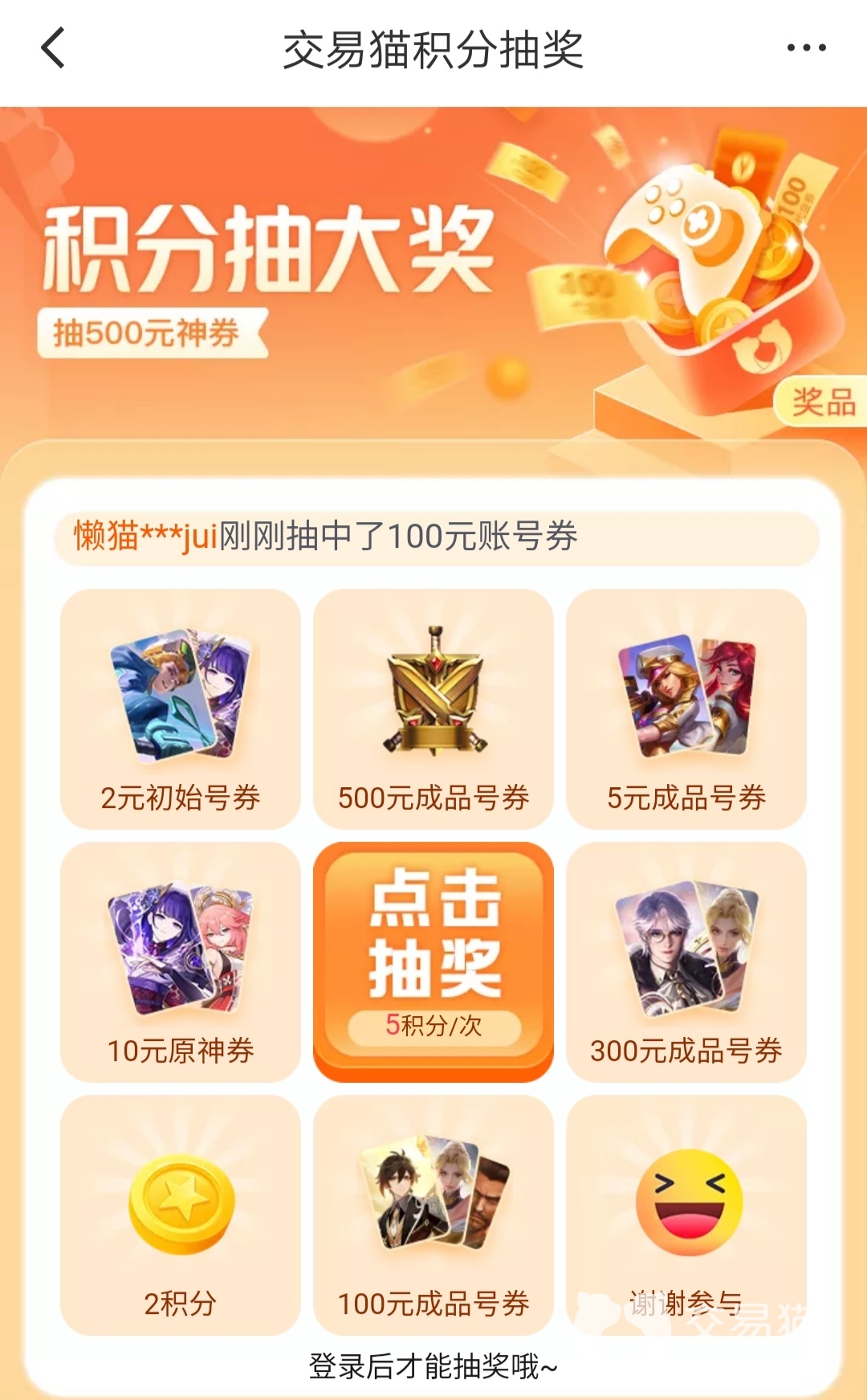 交易猫上的活动不要错过。在交易猫上的签到中心,每日签到可以领取签到积分,积分可有大用场,可以用来买号。想要试一下手气的玩家们可以攒一攒积分,5个积分凑一次,奖品非常丰厚。如果手气好的话会抽到大额买号优惠券,那样子买号的话就会大大实惠了。