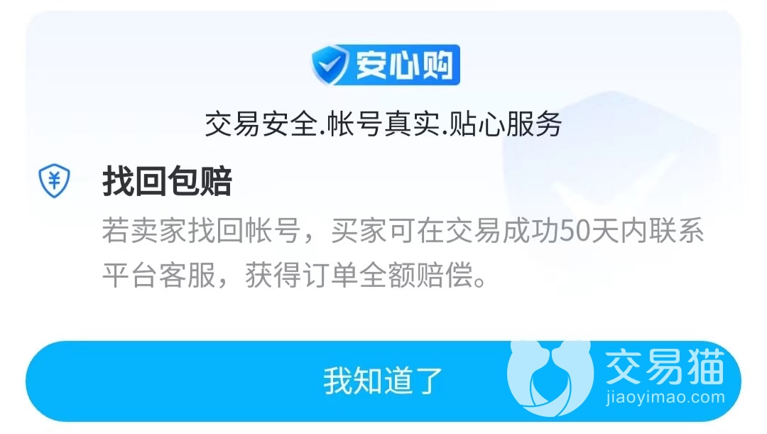 交易猫上售后期长。如果买家选择了的卖家有提供“找回包赔”服务的话,那么买家将会拥有超长的售后期,怎么说呢。“找回包赔”服务就是指当交易完成之后,在50天内如果账户被找回了,那么这笔交易的由平台全额赔偿。这不相当于这几天的游戏体验白赚了,也算是对买家的一种保障。