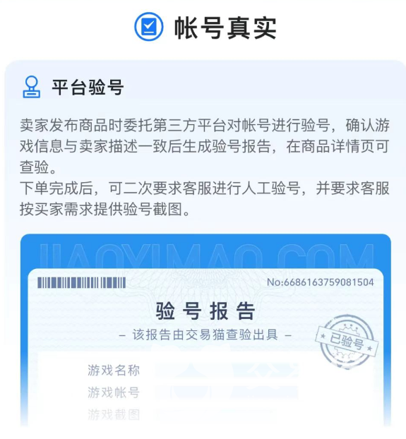 有些同学也表示之前购买账号经常出现账号不符的情况,花钱买到手的账号发现里面什么都没有,或者是里面有些“缺斤少两”,为了避免这种问题的出现,交易猫增添了双向的验号服务,一是可以商家主动将账号交给平台去验号,二是在交易过程之中就能先登录账号看看是否和介绍一致,要是发现账号不满意或是和介绍内容有出入的话,即可直接中止交易要求退款。