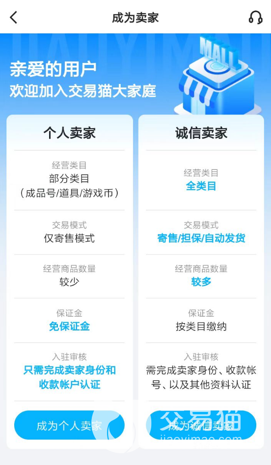 3、而免费的卖家身份,依然也是平台的一个特色认证功能。为了方便那些只想要进行一次性账号处理的玩家,个人卖家身份将满足各位的交易需求。但同时也提供了第二种诚信卖家的选择,更专业的服务以及支持更多类型的商品也是游戏,适合想要成为职业卖家的人来进行申请。
