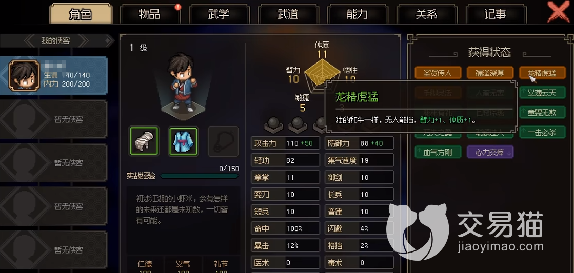 以上就是大侠立志传先天属性提升方法的介绍了,至于玩家需要什么样的属性开局就看你这局特征刷的如何了,还有游戏的难度多高了,修罗模式能够刷出很多高超的品质,但是其他模式出的特征就很弱鸡了,能够达到上面的搭配就比较的少了,相应的也不怎么能用到这些天赋。