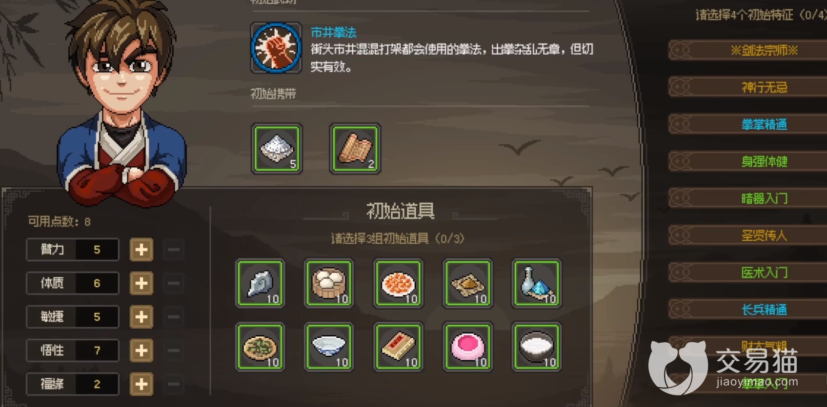 首先开始游戏可以刷出一排的初始特征,在里面选择四个搭配上之后可以获取相应的提升,主要影响游戏中npc的对话还有初始的天赋,比如臂力体质敏捷悟性福源等,这些在游戏当中会影响在方方面面当中。