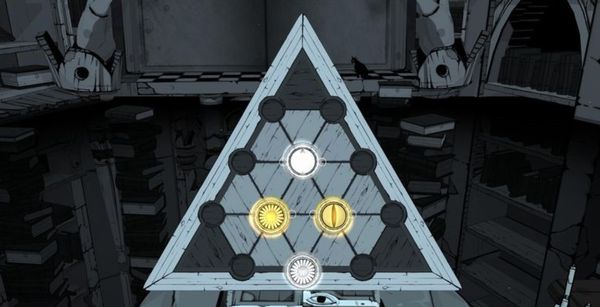 当大家来到第六关的房间一第一阶段的时候可以看到一个圆台,此时我们有一个道具书,然后我们把书放到这个台子上面就会出现一个棋盘,要想得到下面的线索,首先得把这个棋盘给它破解了,大家可以先观察一下这个棋盘,然后再按照下面的步骤去操作一下。