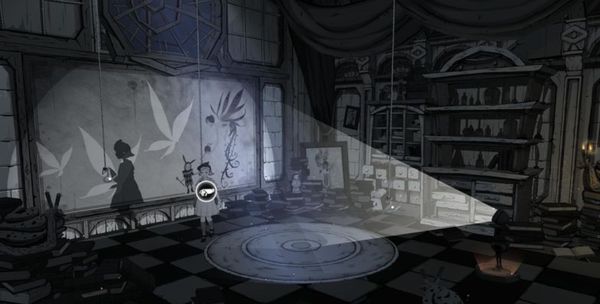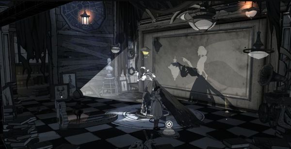 接着大家来到房间三之后,会看到一个非常好看的女士,但她并不是真人,大家与她进行互动,然后让女士俯下身,接着再移动幻灯片的开关将女士的影子在墙上变得更大,接着再来到这个墙边,变成影子在踩着女士的影子拿到吊灯,之后将女士恢复原形就可以了。大家拿到这个吊灯之后,再把它放到女士面前的钩子上就能获得一个水壶,并且完成当前的解密。