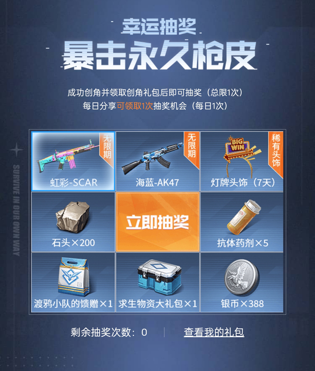 成功注册后可以立刻领取一个稀有的“猫耳”头饰,每个玩家有各自对应的CDkey,等黎明觉醒游戏上线后就可以在游戏里使用。除了猫耳头饰外,还可以参与1次幸运抽奖,每天将该活动页面分享给其他好友可以额外获得1次抽奖,奖品主要包含各种材料、药剂、枪皮、以及无限期的彩虹SCAR这把枪。