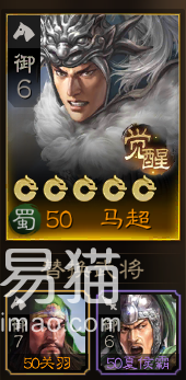 马超虽是冲阵的骑兵,但战法能在普攻后衔接范围伤害,对周围敌人造成的打击在高额武力的加持下伤害还是很明显的,想要替换的话可以用“关羽”或者“夏侯霸”,前者同为金卡,适合在没抽到马超但抽到关羽的时候使用,其范围伤害加上洪水效果同样能打出不俗威力。后者则是一个过渡使用的紫卡,虽然他只有单体伤害但却能降低敌人统御,从而造福队友。
