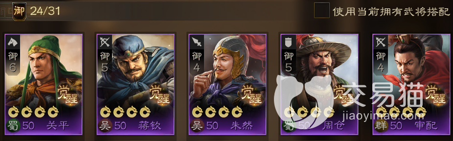 该套阵容的配置为:关平+蒋钦+朱然+周仓+审配。这些卡在前期都相当容易获得,其中一些甚至是直接白送的,所以组建难度较低,而且它们在阵容的前排,后排,乃至控制与增益上都比较完善,能够在多维度提升前期开荒的效率。当然,这些卡由于都是紫卡,所以能够替换的人选也是很多的,下面小编就针对他们各自的作用给大家讲讲可以替换的武将。