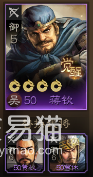 蒋钦在这一套阵容中的作用是负责AOE输出,其中输出的伤害类型同时包括了战法所直接提供的兵刃伤害,和灼烧所间接提供的谋略伤害。他的伤害范围和类型都是十分丰富的,因此如果想要替换的话,可以选择同为弓兵的“黄权”与“曹休”,前者同样有着范围伤害,但伤害类型少了兵刃,后者则是单纯的输出频率高,能够弥补没有范围伤害的缺陷。