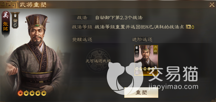 满足前面所说的其中任意一个要求之后,都可以进行重塑了,点击重塑之后,会将装备上的第二战法还有第三战法给自动卸下去,然后充值这两套战法的战法等级,并且会返还一部分升级战法所消耗的战法点,而进阶的等级和觉醒的等级都会直接恢复到初始状态变成白板。