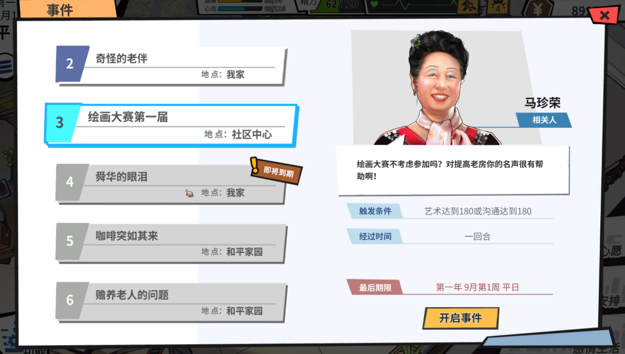 首先在最初开始游玩的时候,小伙伴们一定要选择去做家务,因为这样可以大幅度增加游戏里老伴的好感度,在这款游戏里好感度的多少决定了后面小伙伴们游玩时,每个月所能使用的零花钱有多少,所以显得尤为重要。