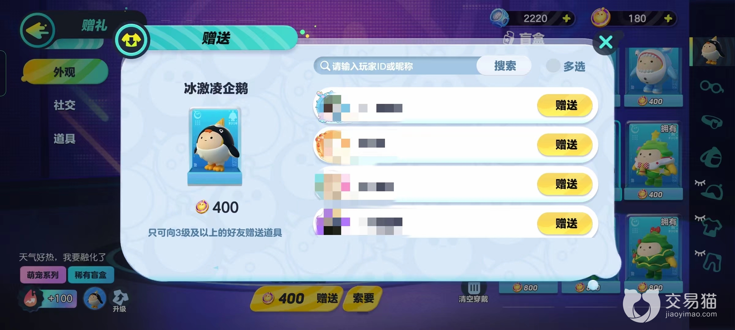 就目前蛋仔派对游戏版本来说,是没有办法直接给好友赠送蛋币的。因此玩家如果想要给好朋友赠送喜欢的东西,可以自己点击商城进入到商城游戏商城当中,选择好朋友喜欢的皮肤,选择赠送给好朋友就可以了。