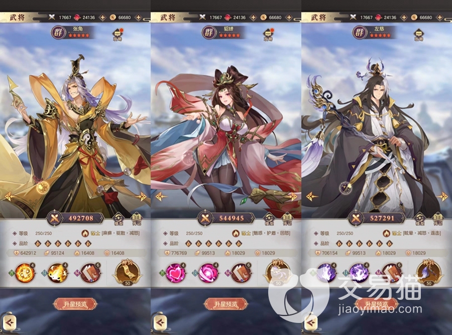 貂蝉、左慈、张角都是控制能力很强的角色,可以打乱敌人的输出节奏。貂蝉的怒气技能万花缭乱,攻击目标是对方的前排,同时有40%的怪率魅惑目标,如果攻击的对象是男性角色,魅惑概率则增加10%,受到魅惑的目标将无法行动一回合,魅惑结束后并为貂蝉回复生命值。左慈则是可以高概率眩晕敌人,他的普攻和怒气技能都可以给敌人附加眩晕效果。张角普攻有50%的概率对敌人造成麻痹,怒气值黄天当立会驱散敌人随机1个增益效果。
