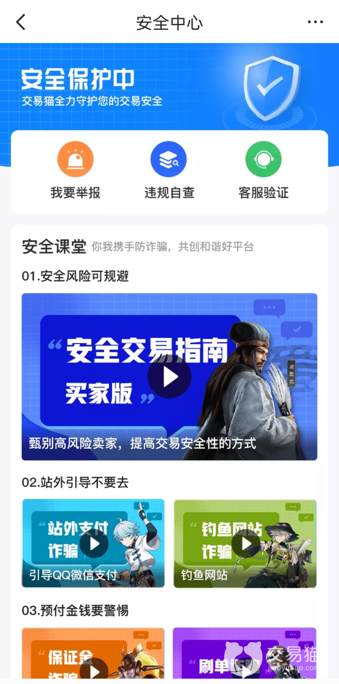 在网络上进行账号交易是存在一定风险的。但是在交易猫游戏交易平台当中,客服人员通常会给予用户温暖的安全小贴士。这种功能时刻提醒着用户哪种行为是十分危险的,哪种情况是遭遇了骗子。一旦用户在平台中遭遇了恶意欺骗,请立即向客服举报或者仲裁,客服就会封掉骗子们的账号,使他们无法使用交易猫交易。