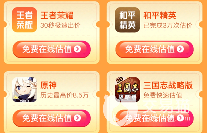 交易猫这个app小伙伴们可以尝试体验,这是一款功能比较全面的交易软件,拥有超多服务,玩家们可以点击上方链接下载,玩家们卖号如果不知道怎么定价的,交易猫可以帮助我们实现在线估价,点击我的,进入个人中心,可以看到一个免费估值功能,里面会有四款游戏的免费估值板块,玩家们可以根据自己想要卖号的游戏类别进行选择,耐心等待几秒,官方会给出一个比较详细的价格数据,我们可以作为一个参考使用。