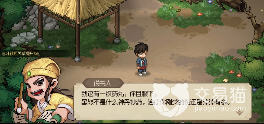 其中首个是可以获取十点义气值,下一个是获取十点信用值,第三个是十点仁德,最后一个是获取两百银两。最后将这个任务做完还能获取到五十点的名声和一点与叶家军之间的关系值。此外各位当前如果获取了暗取技能,那么就可以在说书人身上偷取些东西。
