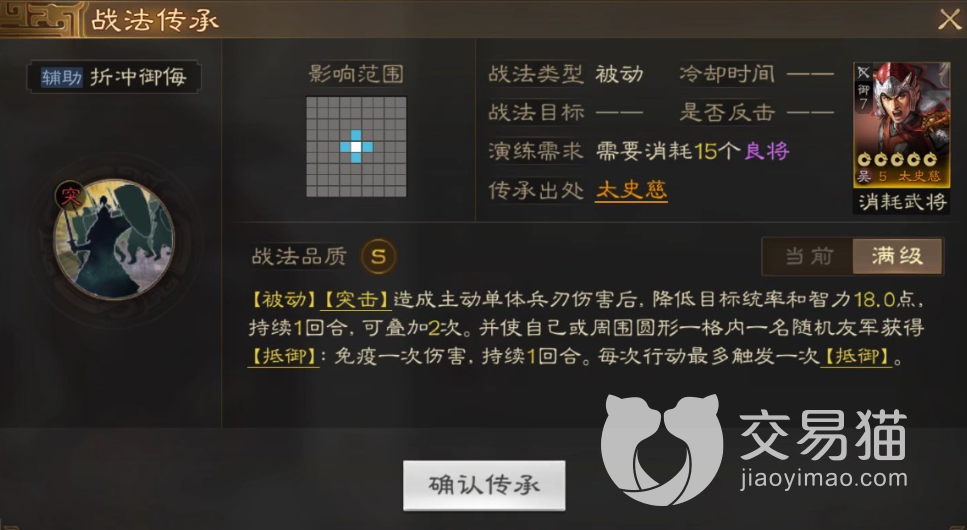 因此在阵容搭配上玩家可以使用肉盾或者治疗型武将进行搭配,因为这样的阵容能够保证太史慈的生存能力。而“折冲御侮”的效果可以增加辅助武将的生存能力。这样玩家可以选择慢慢的消耗敌人,由于太史慈的战法削弱效果敌人的伤害会越来越低。