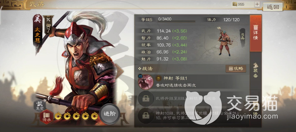 大家进入游戏的第一眼就能够发现太史慈是吴国实力的武将,并且有着极高的武力值,而游戏中也根据历史加载的内容给太史慈搭配的士兵是弓兵。因此太史慈是完全可以作为核心射手担任输出或者在后排不到收割敌人。