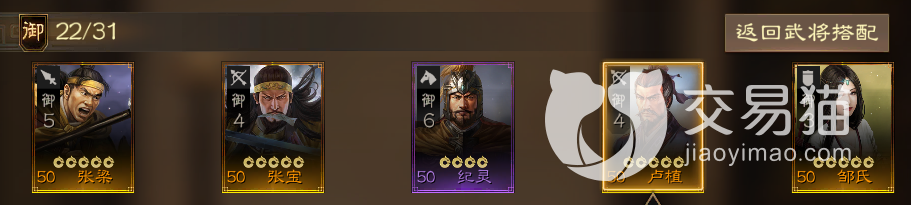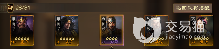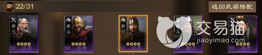 该阵容属于全紫卡阵容,不过兵种分配较为均衡,可以看到他是双骑兵,双弓兵加一盾兵的组成,丁原可以负责躲在后方输出,而李肃则给予兵力回复来保障冲阵的两个骑兵的生存,最后的郭汜本身也是盾兵,有着不错的身板,可以选择和李傕纪灵一起冲,也可以选择缩在后方来保护后排,在前期开荒的时候这套阵容还是能够起到一定用武之地的,只是到了后面金卡横行的环境中威力会极速骤降。