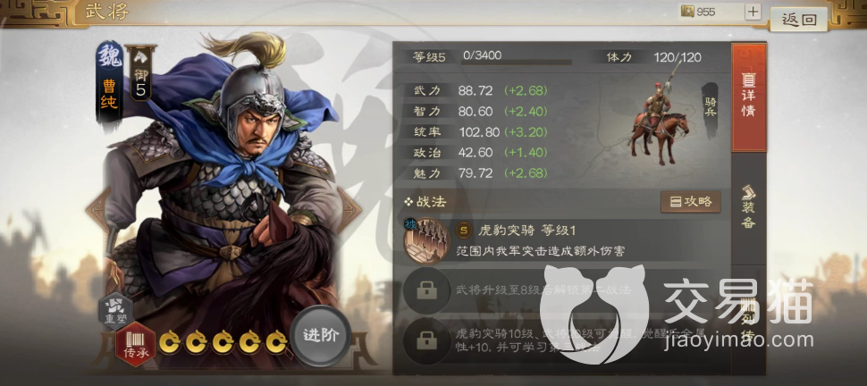 首先大家能够看到曹纯是属于魏国势力的武将,并且曹纯的武力值也高达88点,虽然在伤害方面可能没有那么恐怖,但是在同类型的武将中也算比较高的。并且他的统率能力是高达102,这么高数值在游戏中是很少见。