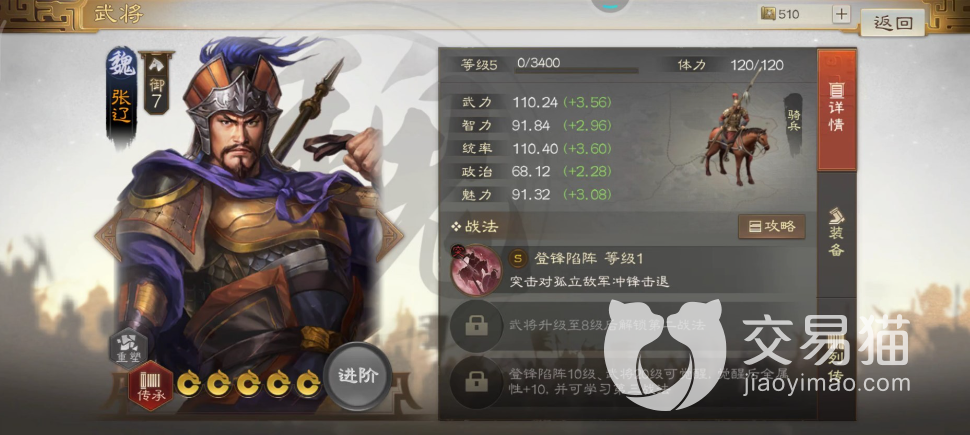 首先就是张辽的战法技能在对敌人造成攻击的时候还不会被反击,并且能够对敌人造成二次伤害。如果是敌人是“孤立”状态的话那么还会造成第三次伤害并且击退敌人一次,如果对方是近战的士兵那么就需要花费回合来进行移动。