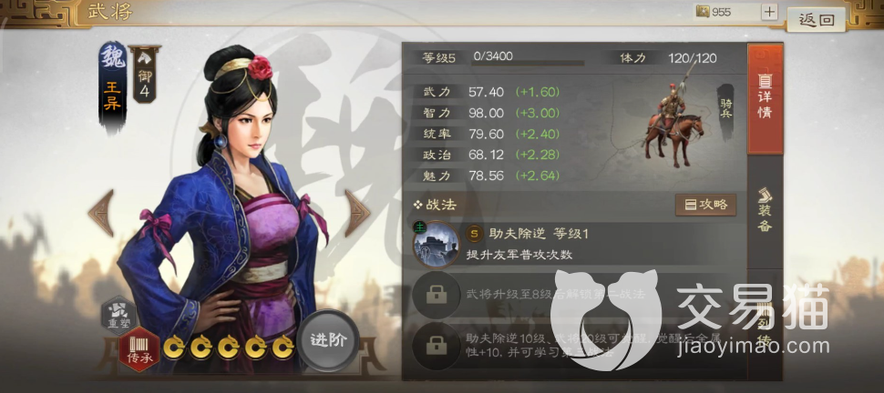 首先王异在战斗中因为战法技能“助夫除逆”的技能是一个辅助性的角色,能够为我方的输出来增加伤害,因此玩家如果是围绕输出为核心来打造阵容的话王异就是非常有用的,并且还可以通过骑兵极快的奔袭能力帮助队友偷袭。