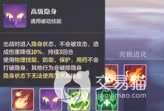 7、高级隐身: 在出战的3个回合中,进入隐身状态不会被敌人技能锁定,造成的伤害降低10%。