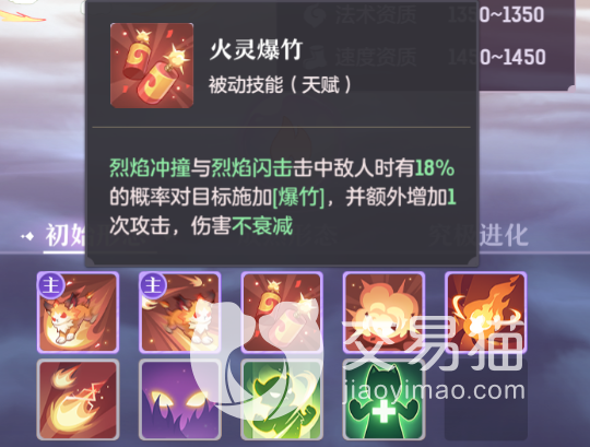3、火灵爆竹:两个主技能在命中的情况下有18%的概率对命中目标施加“爆竹”效果,ing获得一次继续攻击的机会。