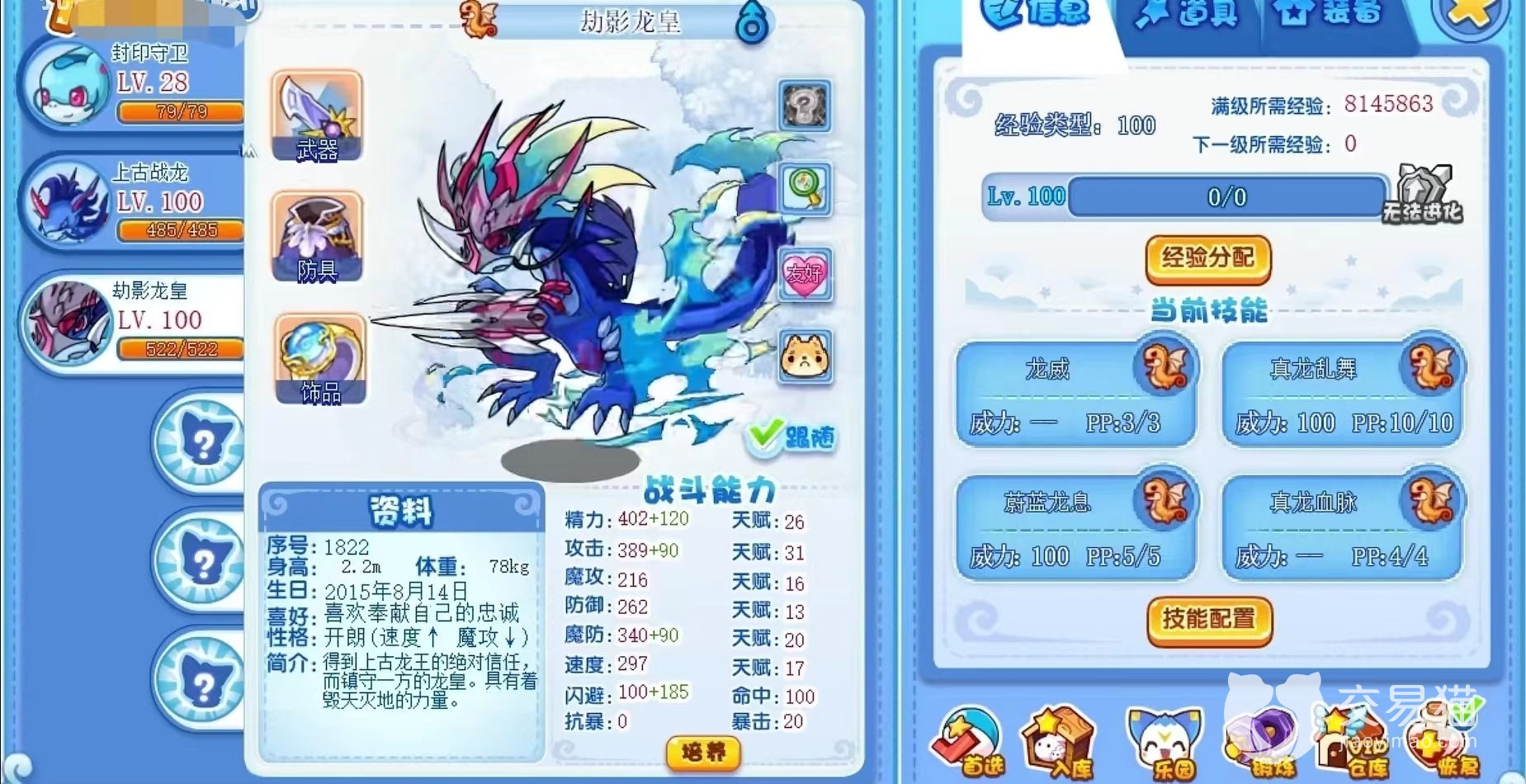 首先,第一个大家可以去训练一下的就是劫影龙皇,这个宠物是主打攻击的,拥有着很大的攻击命中率,而且攻击范围很广,他的闪避速度也是值得一说的,反应能力实在是太快了,同时拥有这两个属性,所以在战斗中就不仅可以对敌人实施攻击,还能在敌人攻击他的时候快速的实施躲避,再者说他本身的防御能力也不弱,就算在战斗的时候遇上强大的敌人,也能迅速逃脱,虽然说在战斗的过程中看起来这个宠物的赢面不是很大,但是会逐渐发现,在后期有很强大的扭转局势的力量,这就是所谓的爆发力很强。