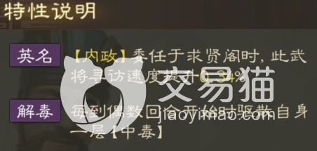 还有一个特性则是在偶数回合的时候能够驱散自己的中毒效果,一层,该特性的局限性非常的大,并没有那么多使用毒的武将,而且还必须在偶数回合才能够触发,对战斗的帮助意义不大,综合来说该武将的基础强度一般,想要让其上场战斗的话,只能考虑转型,特性和基础战法都没有实质性的帮助,养成的成本会高很多。