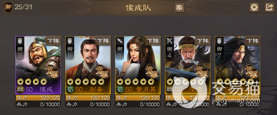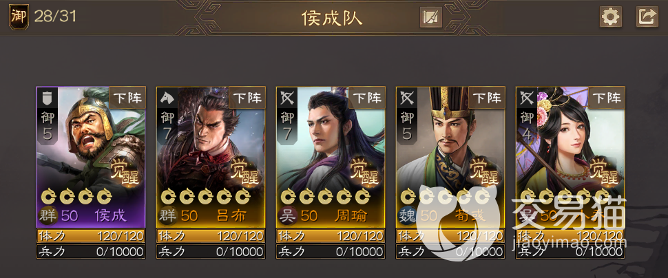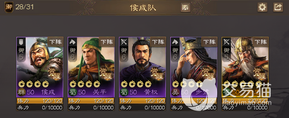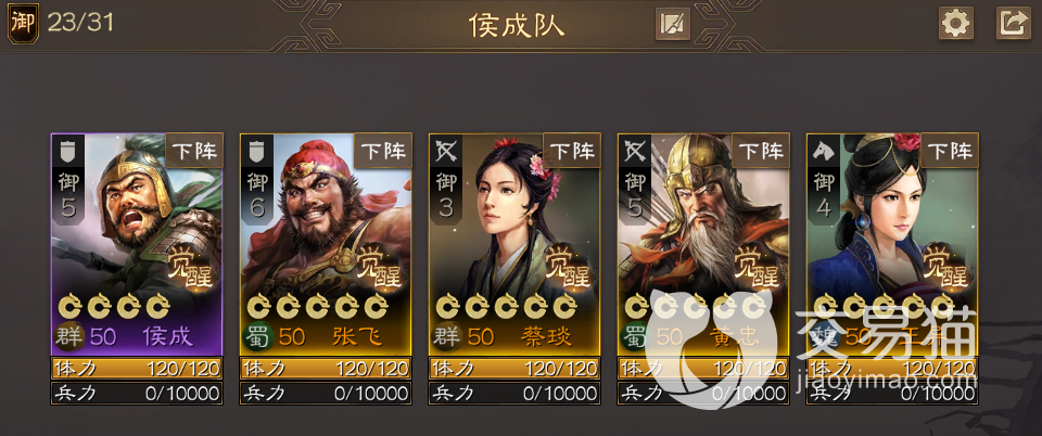 阵容五:侯成+关平+黄权+步骘+黄忠。