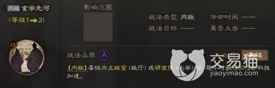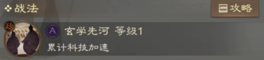 其自带战法为玄学先河,属于内政委任型战法,在该武将委任研发使以及主政官的时候,都能够提升不少的科技速度,内政武将的数量并不多,但是内政的职位空缺却不少,该战法虽然没有作战能力,但是对于资源获取却提供了非常多的帮助。