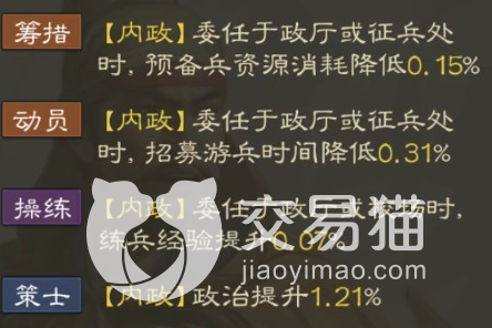 其特性都是与内政资源有关,其中策士的特性能够提升政治百分比,虽然只有1.21%的提升,但是随着玩家的政治积累越来越高,后期的1.21%还是非常多的,虽然该武将可以转型成为辅助型增伤,但是其近战的基础特点与弓兵相比的话会差的更多,还是老老实实的做内政比较不错。