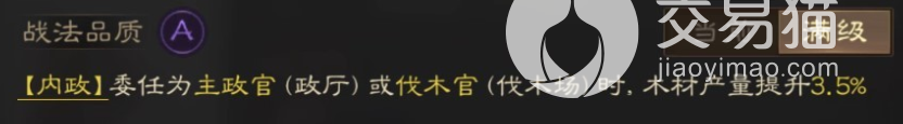该武将自带的战法为枝叶扶起疏,在委任官员的时候能够提升木材的收益,该战法传承下去会很好,如果玩家没有合适的武将替代远程输出或者是辅助的话,该战法可以先替换掉,直接转型,如果缺少的并不多,那么可以留着,不用传承下去,节省一些资源,后面直接去做内政官就可以了。