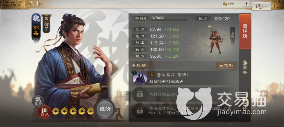 郭嘉作为一名谋略家,他的属性面板中武力较低这个是非常正常的,甚至67点的武力比一些谋士都要厉害很多,特别是他的其他属性都非常的高。从战法技能中不难看住郭嘉是能够造成大量的谋略伤害的同时提升自己的战法效果同时战法冷却时间较少1回合。