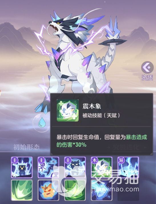 震木象:暴击时回复生命,按照造成的暴击伤害30%进行恢复。虽然是雷麒麟,但是这个技能是木属性恢复血量的,这种麒麟主要还是以辅助我方血量少的角色为主,对伤害的提升并不大。
