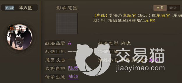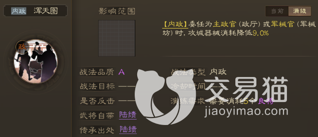 其自带战法为浑天图,在武将委任内政官或者是军械官的时候,能够降低攻城器械的资源消耗占比,可以理解为一个勤俭持家的战法,该战法的作用相当大,毕竟这款游戏对于资源的需求量非常的高,省下一点就能够更换成其他有用的战力资源。