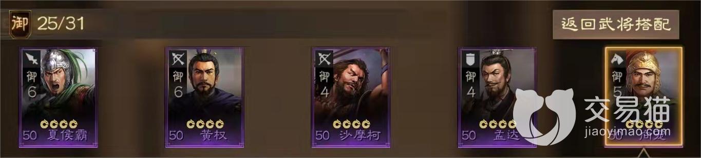 该阵容属于全紫卡阵容,御值也只需要25点,在前中期性价比很高,因为其阵容配置比较均衡,其中黄权和沙摩柯两个弓兵负责在后方分别进行谋略伤害和兵刃伤害的持续输出,后者还能在连续的攻击中夹杂计穷效果限制敌人的战法施放,然后夏侯霸对敌人降低统率和造成单体兵刃伤害的战法效果也能让队伍输出更进一步。最后的孟达和向宠则分别担当前排和辅助,展现了优秀的承伤和治疗职能。