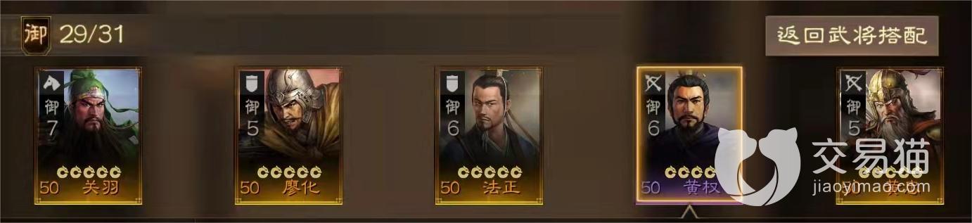 阵容二:关羽+廖化+法正+黄权+黄忠。