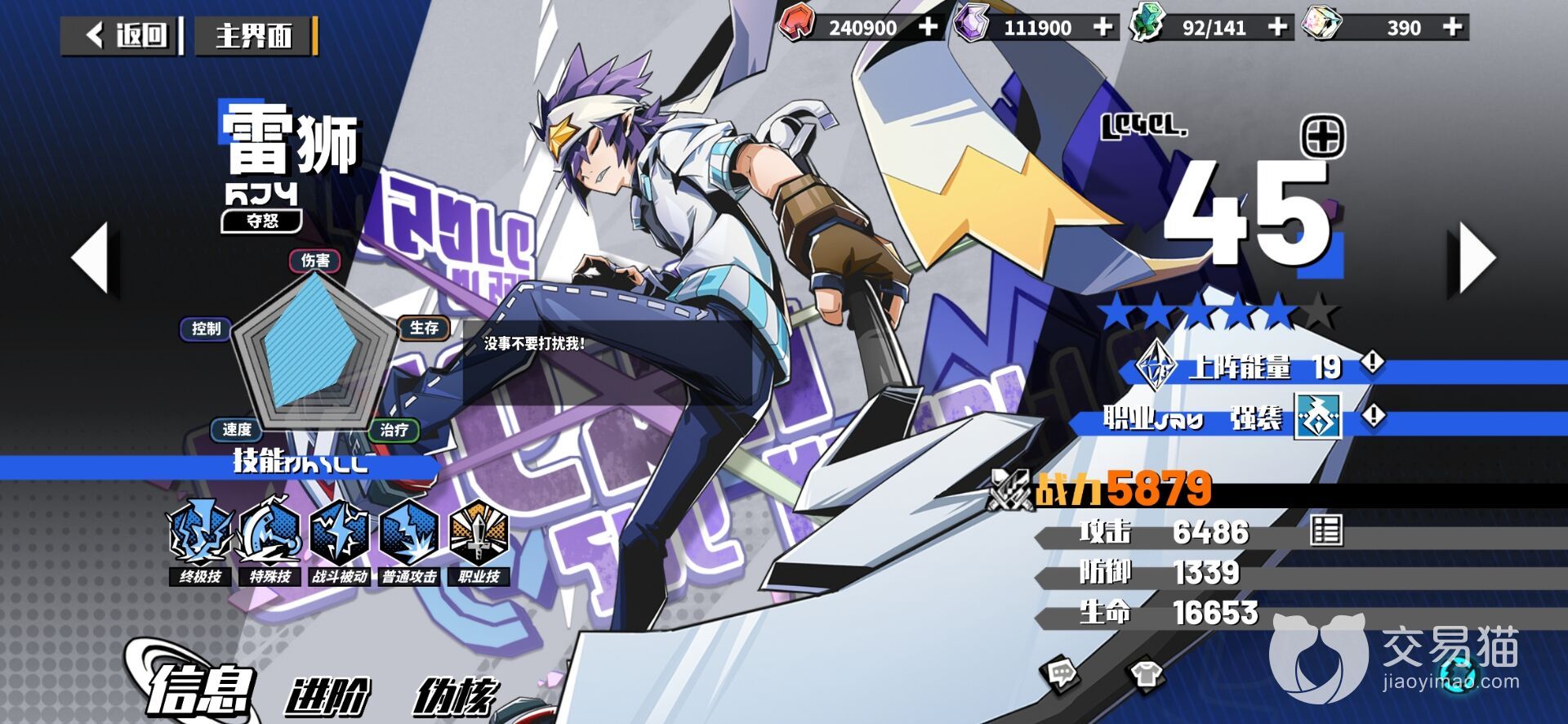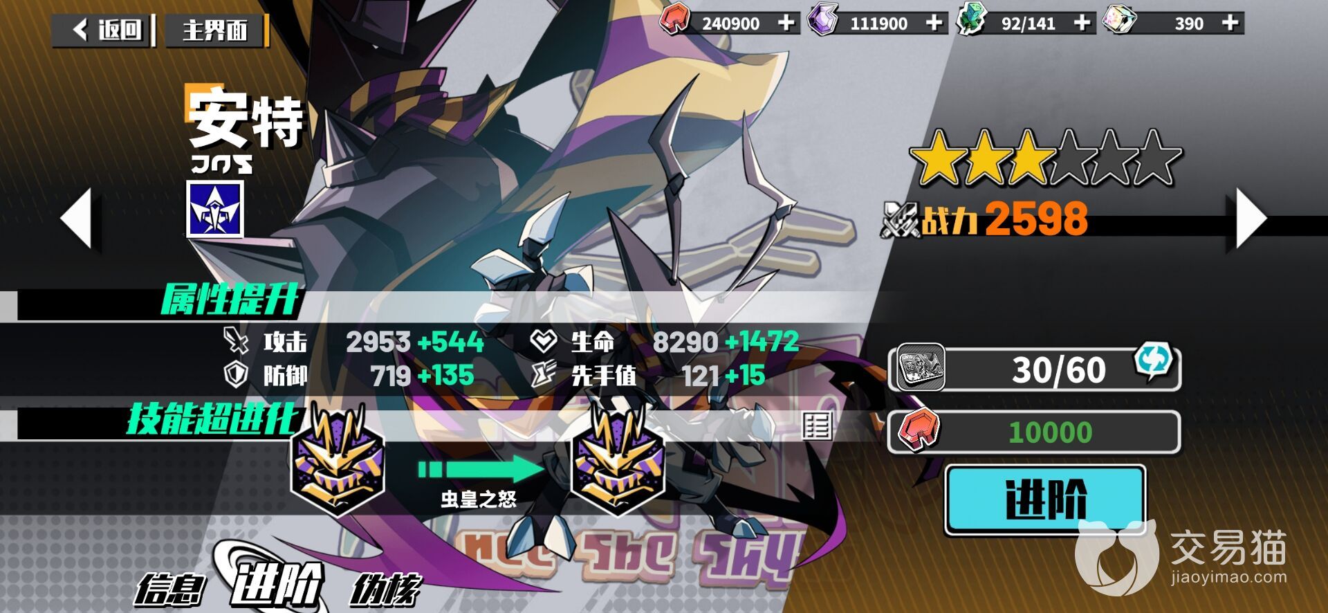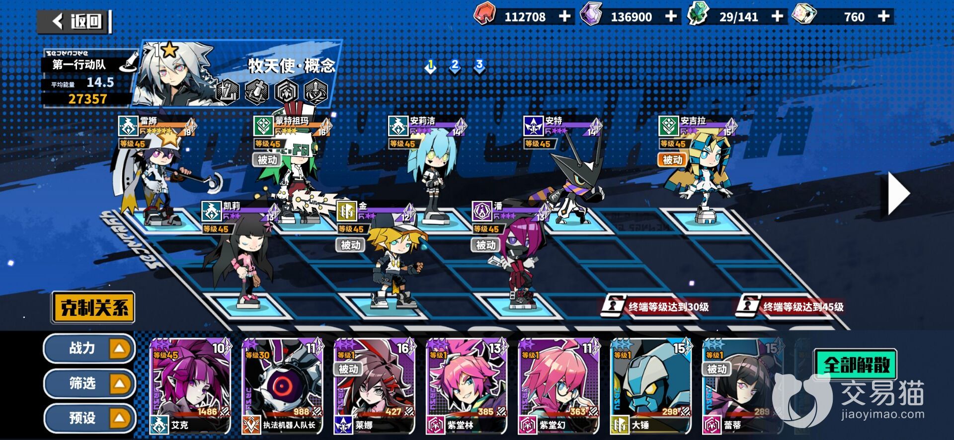 小编给安特搭配的队友有潘、金、凯莉、安吉拉、安特、安莉洁和蒙特祖玛,其中选择金和安吉拉以及凯莉的原因是,这几个角色在游戏内非常好获取,哪怕是一开始只有蓝阶,也可以很快的通过各种方法来进化成紫阶,且战斗中非常好用。